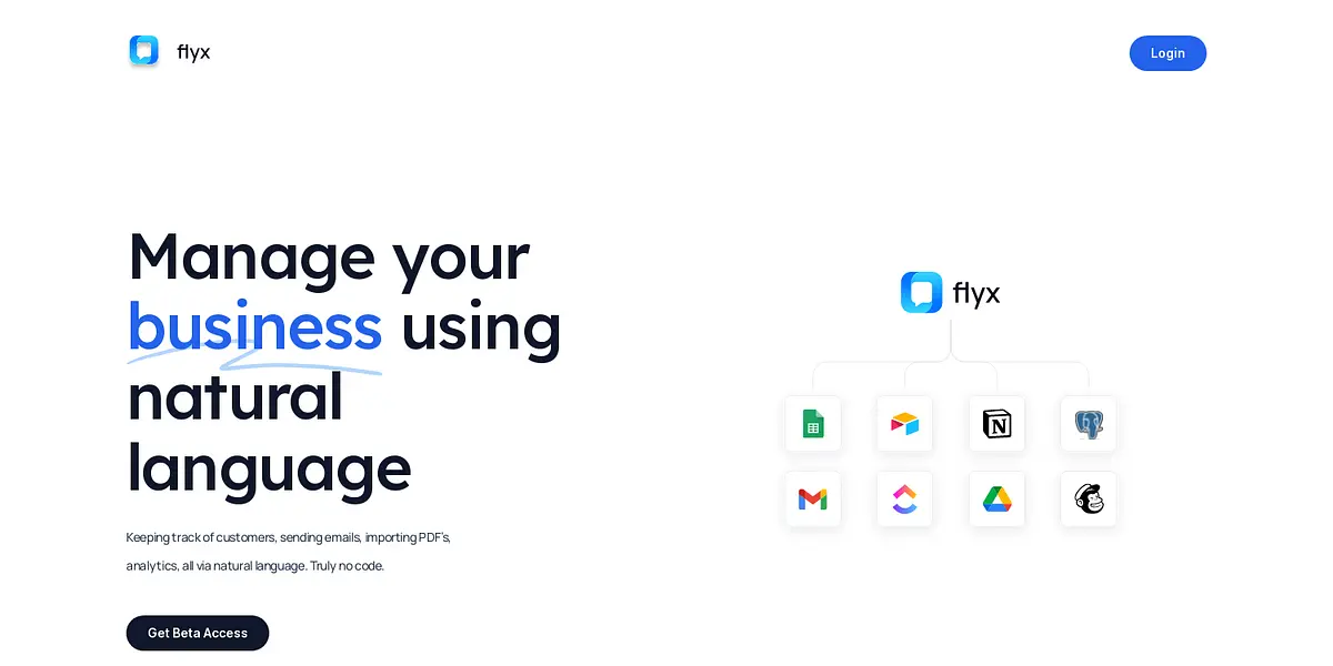 Flyx offers an innovative platform that lets you manage your business in the easiest way possible. Using natural language, you can keep track of your customers, send emails, import PDFs, access analytics, and do much more! With no coding required, Flyx provides a simplified solution for businesses to boost their productivity.
