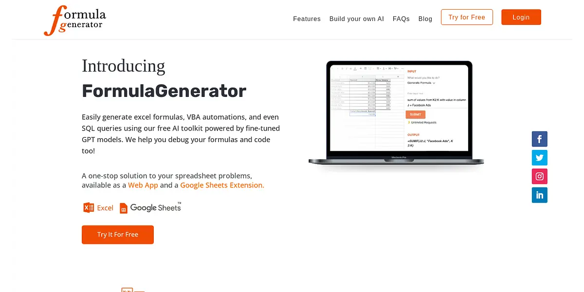 FormulaGenerator is a one-stop solution for all your spreadsheet problems, available as a Web App and a Google Sheets Extension. The platform provides a seamless experience across both platforms. You can use the platform to generate formulas, fix errors, get formula explanations, and generate code, all from one place.