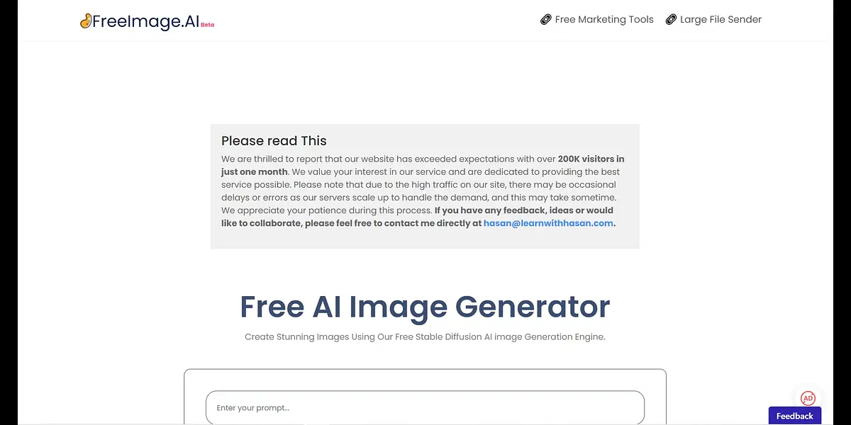 Get free marketing tools and create stunning images with our stable diffusion AI image generation engine. Our website has exceeded expectations with over 200K visitors in just one month. We apologize for any inconvenience caused by our high traffic volume, but we are dedicated to providing the best service possible.