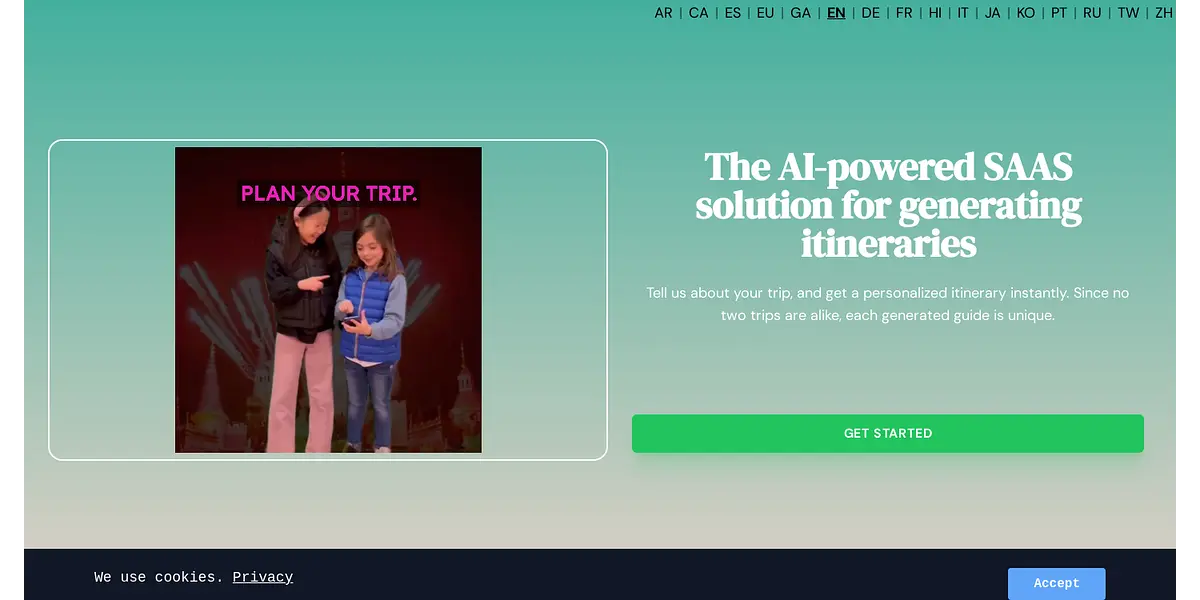 FreePlanTour is an AI-powered SAAS solution that generates personalized itineraries instantly. Every trip is unique, and our solution takes that into account, giving you a guide that's tailored to your needs. Choose from multiple languages and get started with ease!