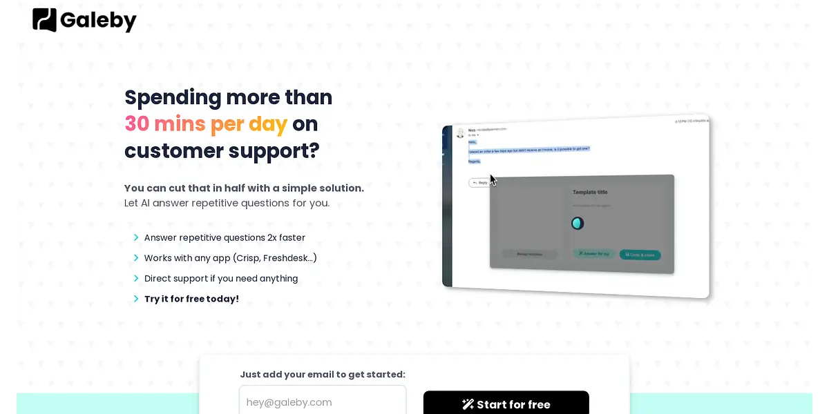 Simplify your customer support with Galeby's AI-powered solution that can answer repetitive questions 2x faster, generate unique replies, and help you personalize communication. Whether you're using Freshdesk or Crisp, Galeby can work with any app and save you time. Try it for free today and streamline your support process!