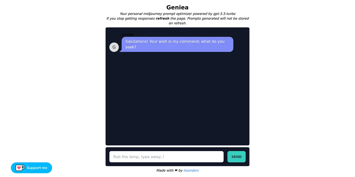 Powered by the latest GPT-3.5-Turbo technology, Geniea is the ultimate writing assistant that provides you with a personalized experience. The genie-like prompt generator greets you with a salutation and invites you to share your need. Whether you're working on a blog post or dreaming up a novel, Geniea is here to help you every step of the way.