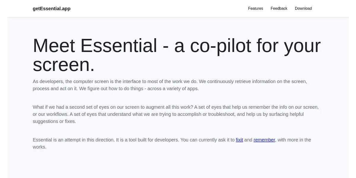 Essential is more than just an app for your Mac; it's your co-pilot for the screen, designed with developers in mind. It is an innovative tool that uses powerful computer vision and AI algorithms to understand and improve the way you work. Whether you're troubleshooting errors, recalling important information, or simply looking to streamline productivity, Essential can help.