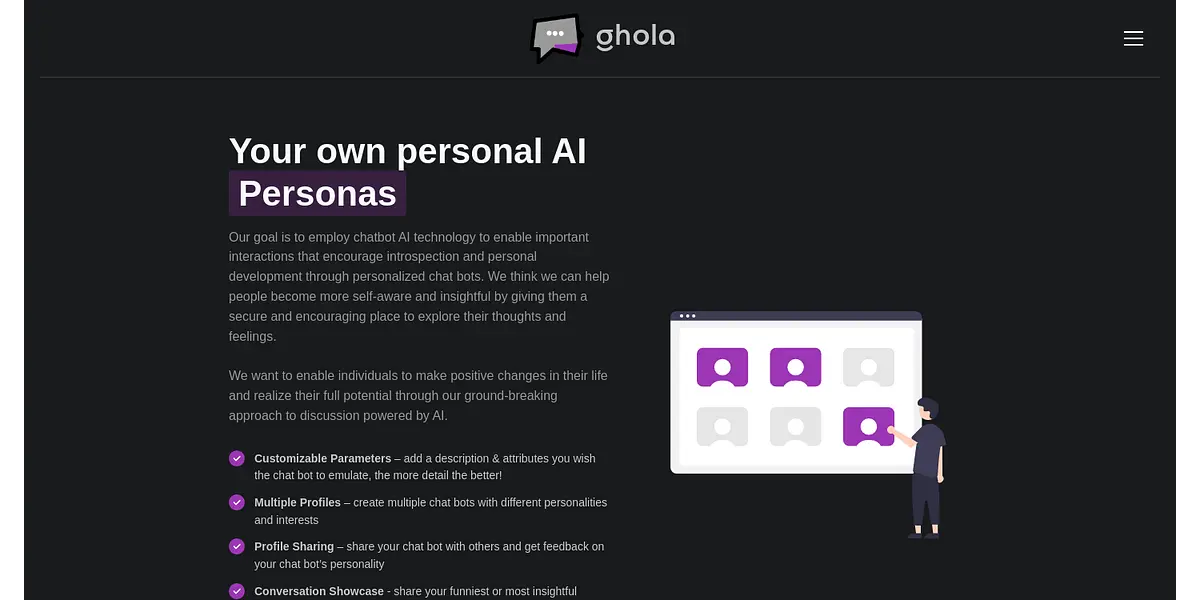 Ghola is an AI chatbot platform that empowers individuals to delve into self-exploration, growth, and development by creating personalized chatbots. With customizable parameters, multiple profiles, and profile sharing, users can create multiple chatbots with unique attributes and share them with others.