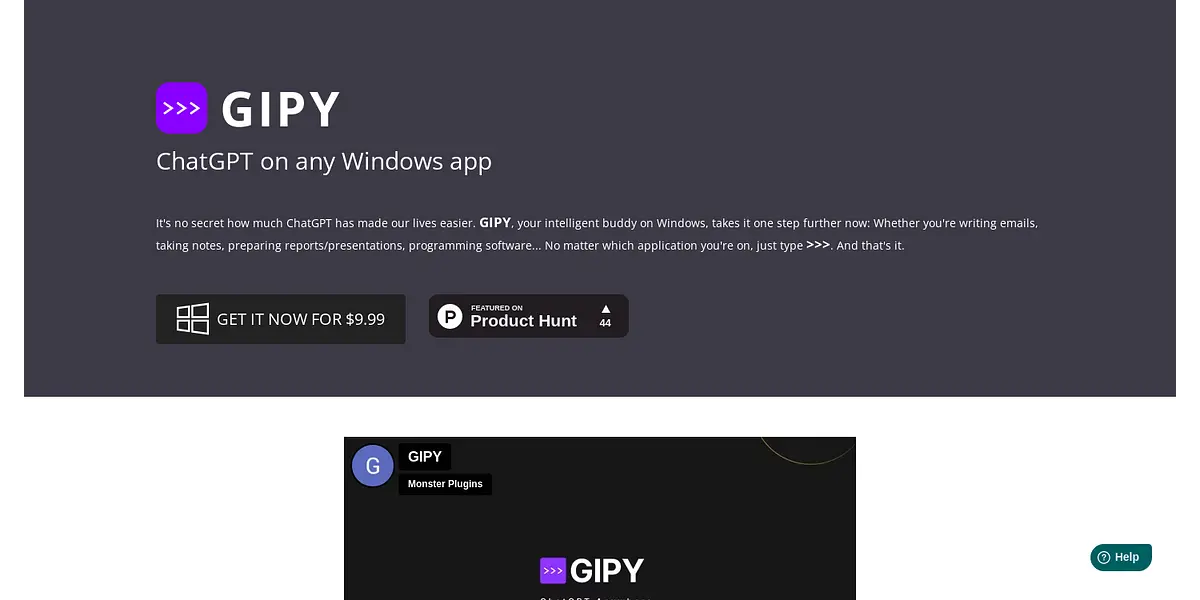 Get GIPY, your personal assistant on Windows, now! With GIPY, you can easily chat, take notes, prepare reports, and program software in any application on your Windows device. Simply type ">>>" followed by your prompt and press SHIFT + ENTER. It's that simple! Try GIPY today for only $9.99.