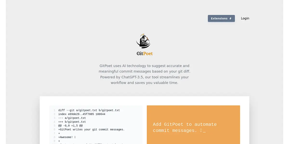 GitPoet is the ultimate tool for developers seeking an efficient and accurate way to generate commit messages. Our AI-powered platform, powered by ChatGPT-3.5, streamlines your workflow and saves you valuable time. Simply paste your git diff output and let GitPoet suggest precisely and engaging commit messages. Sign up now and experience a whole new level of productivity!