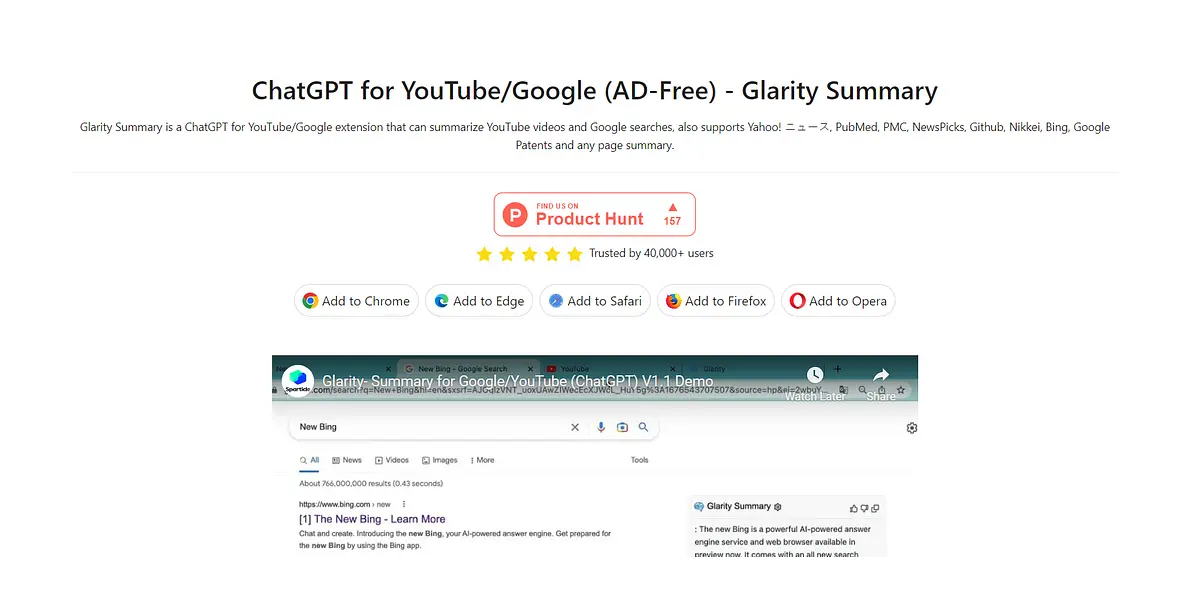 Glarity is a browser extension that provides a personal ChatGPT assistant to help you summarize YouTube videos and Google search results. With support for multiple websites, including Yahoo! PubMed, PMC, NewsPicks, Github, Nikkei, Bing, and Google Patents, Glarity is trusted by over 40,000 users worldwide.