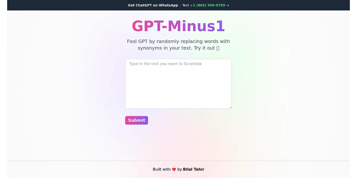 "Enhance your textual content with ChatGPT's revolutionary synonym scramble feature on WhatsApp. Fool GPT and impress your audience with unique, original content generated in just a few clicks!"