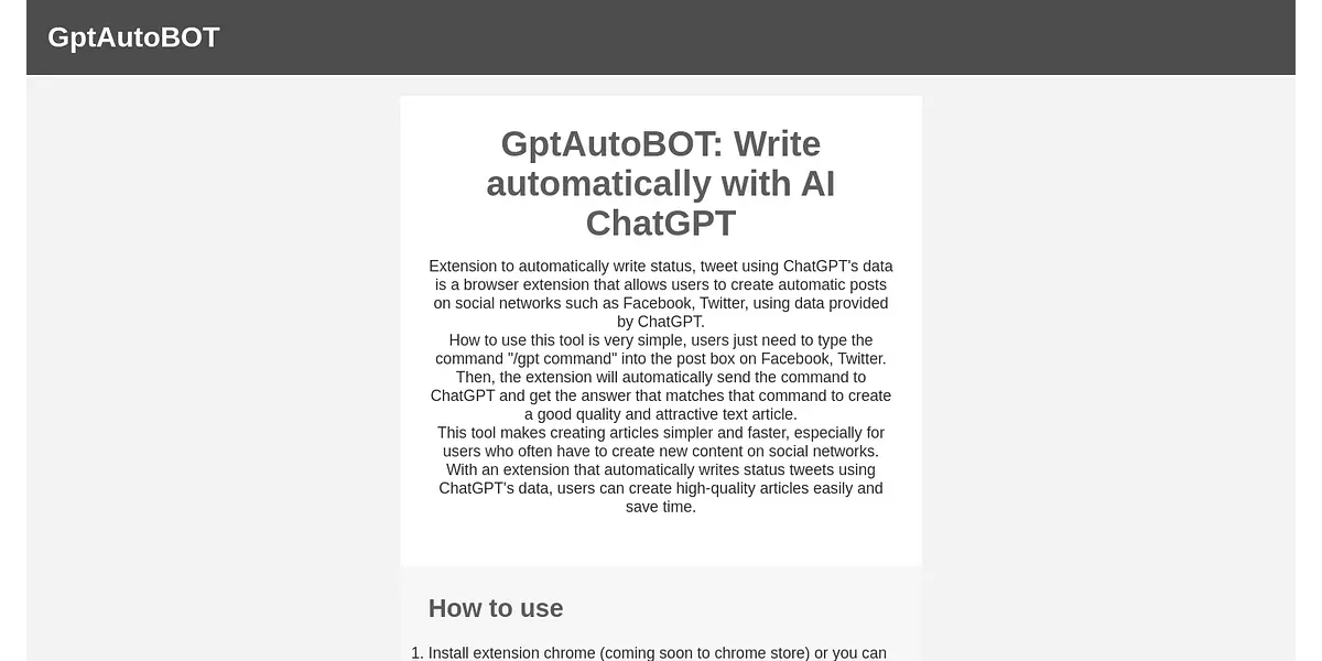 GptAutoBOT simplifies the process of creating articles for social media platforms like Facebook, Twitter, etc. Using GptAutoBOT, users can generate catchy and appealing articles in a matter of seconds. All you need to do is type the command "/gpt command" into your post box on Facebook or Twitter, and the extension will automatically send the command to ChatGPT, an AI language model developed by OpenAI, to get the answer that matches that command to create a good quality and attractive text article.