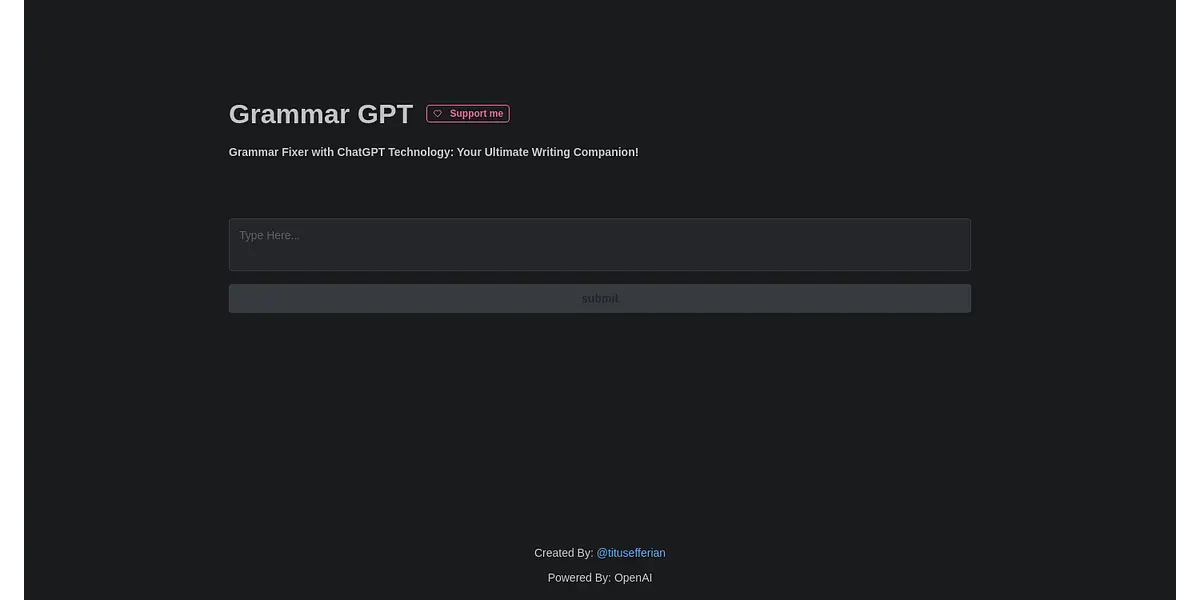 Grammar GPT Support is a powerful automated writing tool developed by @titusefferian and powered by OpenAI. It is designed to help you refine your writing skills and enhance your content, making it perfect for different audiences. With its advanced technology, Grammar GPT Support offers an unparalleled writing experience for anyone looking to improve their writing skills.