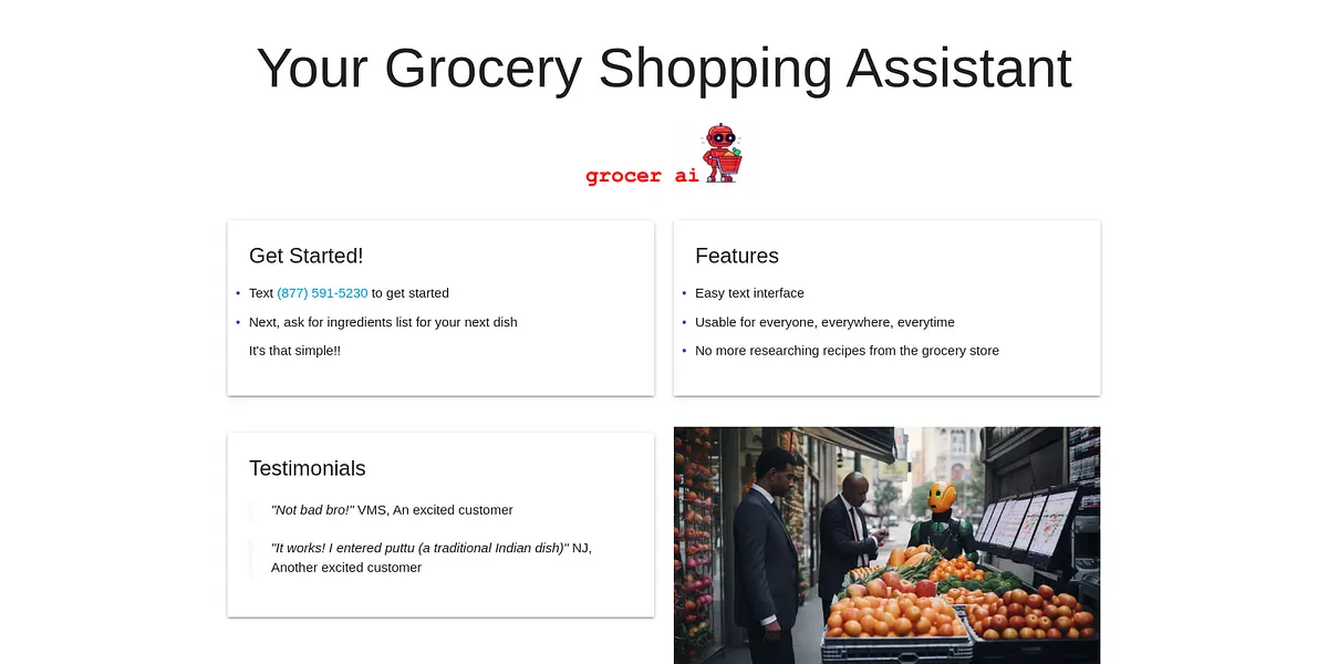 Grocer AI is an AI-based platform that helps you shop for your groceries in a hassle-free, seamless manner. The platform has a simple text interface that's easy to use and accessible to everyone, everywhere, every time. All you have to do is text (877)-591-5230 to get started and ask for the ingredients list for your next dish. It's that simple!
