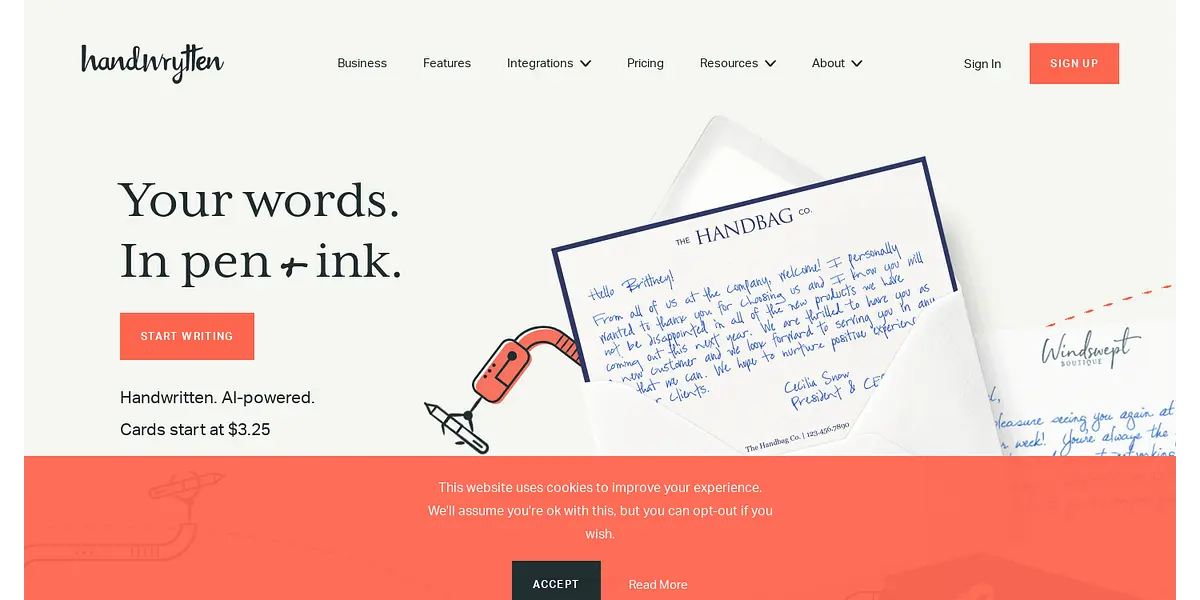 Handwritten notes are a thoughtful way to make a lasting impression, but they can also be time-consuming to write and send. Handwrytten offers a solution that combines the personal touch of a handwritten note with the convenience of digital technology. With their AI-powered custom-designed handwriting robots, Handwrytten allows you to scale your handwritten outreach, creating positive impressions and long-lasting bonds with ease.