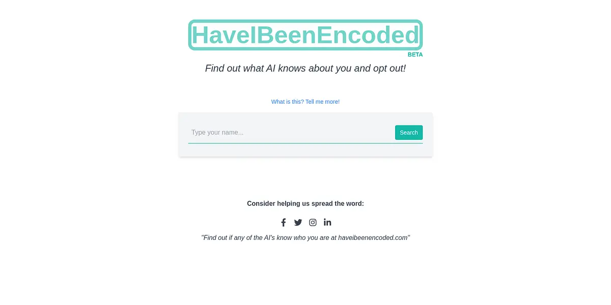 HaveIBeenEncoded Beta is an online platform that helps individuals unveil what artificial intelligence (AI) knows about them. With this tool, you can easily find out if AI has information about you and opt-out accordingly. Spread the word today by telling others to check out HaveIBeenEncoded.com.