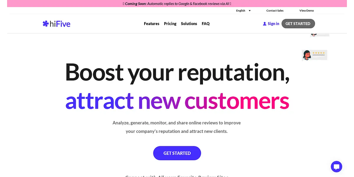 hiFive is a review management platform that helps service-based businesses elevate their online reputation and attract new customers by generating, monitoring, and sharing online reviews across multiple review sites, including Google, Facebook, TripAdvisor, and Yelp. With hiFive, businesses can improve their visibility, trustworthiness, and revenue by leveraging the power of positive customer feedback.