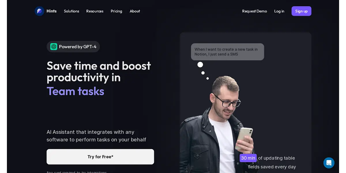 Hints is an AI-based productivity assistant that can help individuals and teams of any size streamline their daily workflows and optimize their performance. By integrating with any software, Hints can perform various tasks on your behalf, from adding data to tables and managing team tasks to note-taking, customer support, to-do lists, and project management. Whether you're an individual looking to boost productivity or a company leader who wants to increase team output, Hints offers a solution for you.