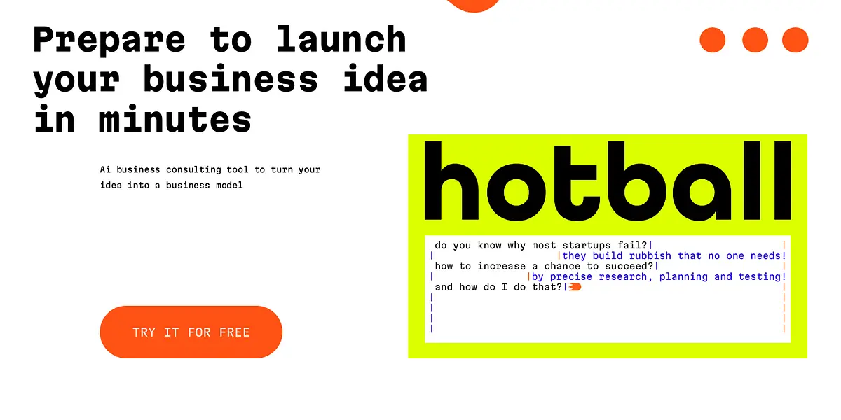 Hotball aims to make launching your business idea as easy and efficient as possible by providing everything you need in one place. Hotball offers a wide range of services and tools, including market research, analytics, and financial planning. Hotball's AI-powered tool provides the perfect framework to turn your idea into a successful venture.