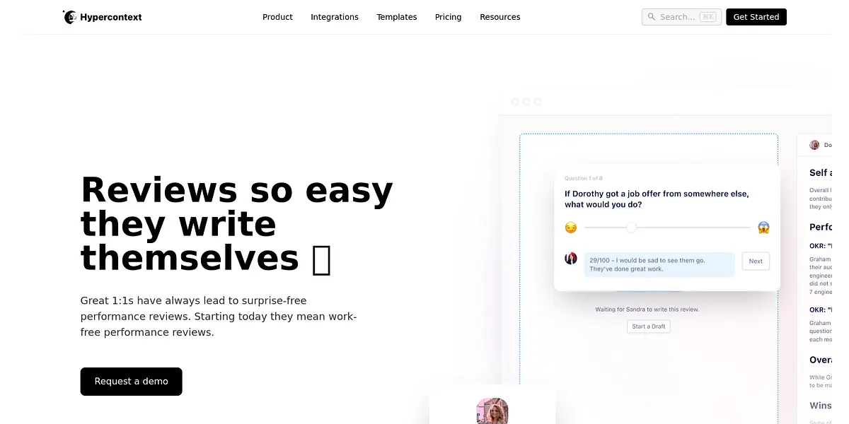 Hypercontext is an AI-powered performance management platform that simplifies the process of performance reviews. With automatic data gathering from regular one-on-ones, goal updates, and tailored assessments, Hypercontext uses AI to draft high-quality reviews that save time and provide insights.