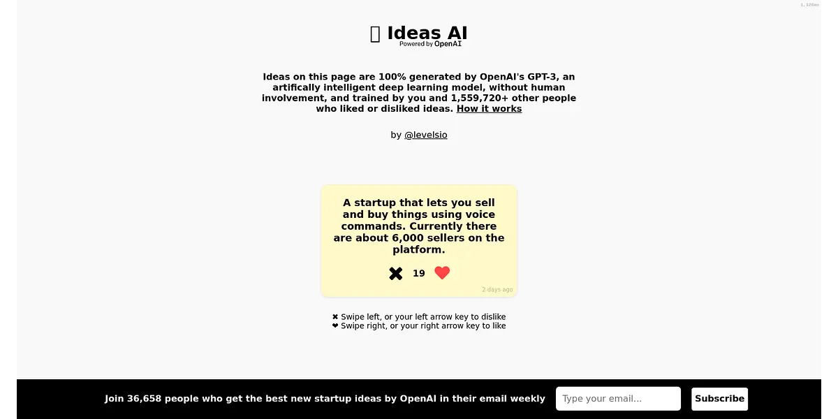 Ideas AI is a platform that uses OpenAI's GPT-3 to generate startup ideas based on your preferences. With over 1.5 million users, you can swipe and select ideas that interest you, and the platform will learn and adapt to your choices. It's a fun and innovative way to explore new business opportunities.