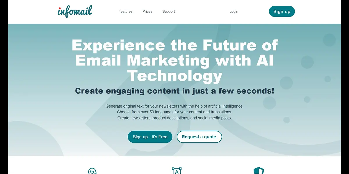 With Infomail, businesses can create engaging content in seconds. With Infomail, newsletters, product descriptions, and social media posts are original. Create unique designs quickly and easily with the AI editor. Infomail manages to send quickly, securely, and without delay.