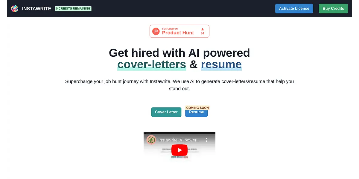Instawrite - Land your dream job with AI-powered cover letters and resumes. Supercharge your job hunt journey with Instawrite and stand out from the crowd. Purchase credits, get your license key, activate it, and start generating the best AI-powered cover letters and resumes to ace your job application in just 4 easy steps. Hear from over 1000 satisfied users.