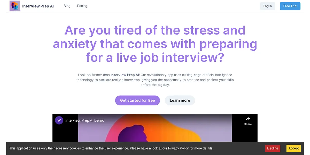 Interview Prep AI is a revolutionary app that uses cutting-edge artificial intelligence technology to simulate real job interviews. With the ability to practice multiple live iterations of your interview and get instant feedback, you'll be able to perfect your skills and reduce stress and anxiety before the big day. Get started for free and take the first step towards interviewing success!