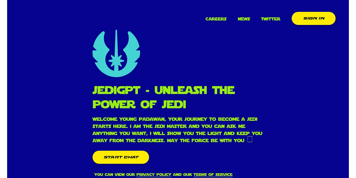 Of course, like any good Jedi, you'll want to make sure you're staying on the right side of the Force. That's why JediGPT also provides important resources like our privacy policy and terms of service, so you can be confident your journey to become a Jedi is a safe one.