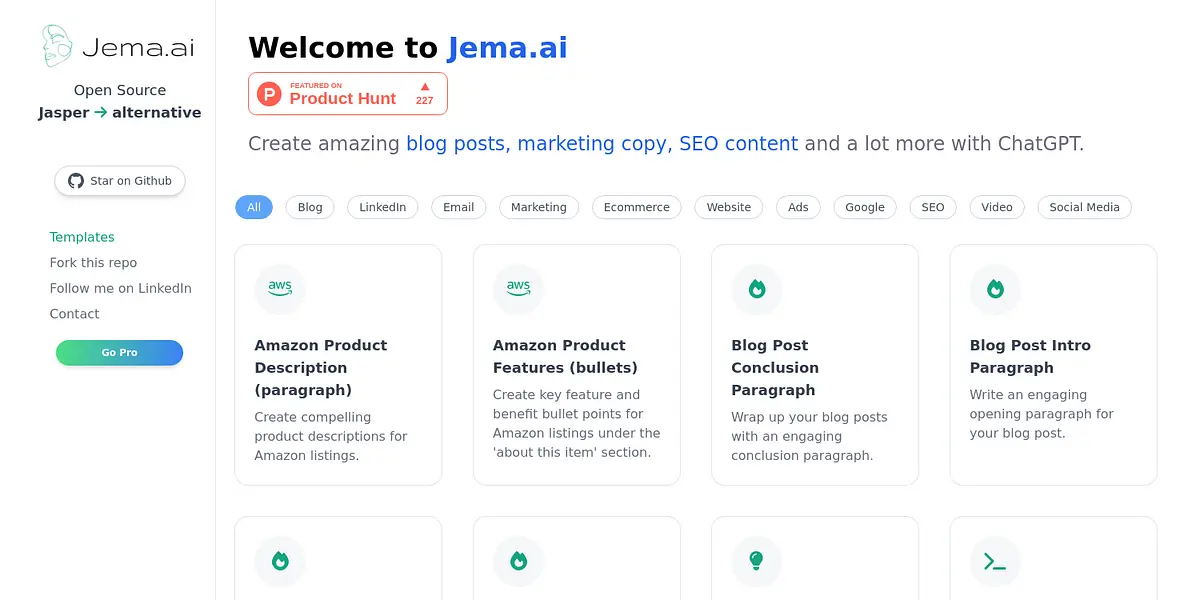 "Revolutionize your content creation using Jema.ai's AI-powered platform. From engaging blog posts to compelling product descriptions, Jema.ai offers a suite of tools to create exceptional content. Say goodbye to writer's block and hello to creativity with Jema.ai!"