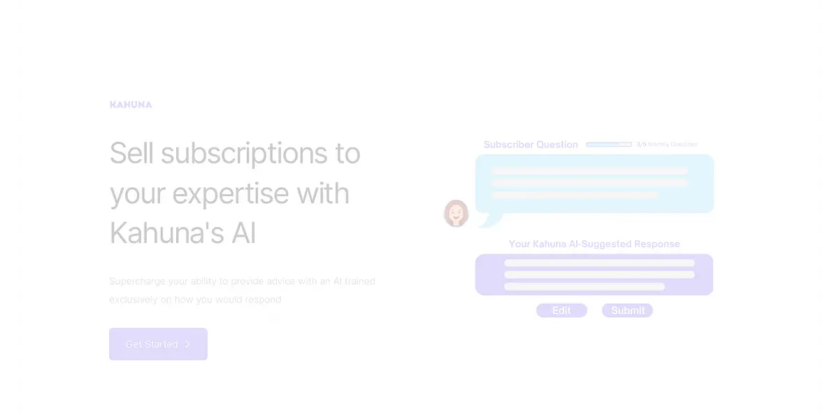 Are you a professional looking to sell your expertise but don't have the time to answer each query that comes your way? Look no further than Kahuna, a revolutionary AI-powered platform designed to supercharge your earning potential. With an AI trained exclusively on your knowledge, Kahuna creates a user-friendly experience that delivers contextually relevant answers to your subscribers. With customizable subscription tiers, you can easily scale the number of monthly questions you answer for individuals and businesses. And the best part? Your profile is shareable across social media channels, making it easy to start collecting paid subscribers. Plus, with one easy-to-use dashboard, managing all of your subscriptions has never been easier. Don't wait – unlock your earning potential with Kahuna today.