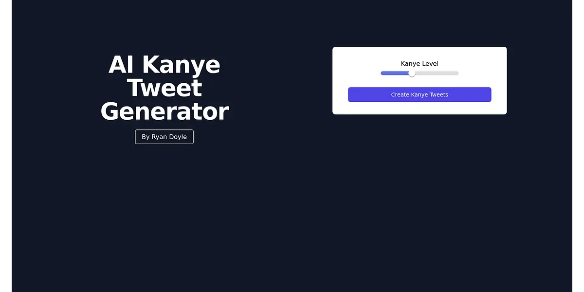 Looking to perfect your Twitter game and become a Kanye-level social media superstar? Look no further than AI Kanye Tweet Generator by Ryan Doyle! With this innovative tool at your disposal, you can generate personalized, one-of-a-kind tweets that epitomize the enigmatic and electrifying style of Kanye West himself. Effortlessly create unique posts on the fly, with unparalleled ease and versatility that will keep your followers hooked for more. Say goodbye to writer's block and hello to unwavering creativity with AI Kanye Tweet Generator. Its intuitive and user-friendly interface guarantees that you'll be unleashing your inner Kanye in no time. Don't settle for being a mere spectator in the Twitterverse - it's time to reign as the ultimate Tweet King with AI Kanye Tweet Generator!