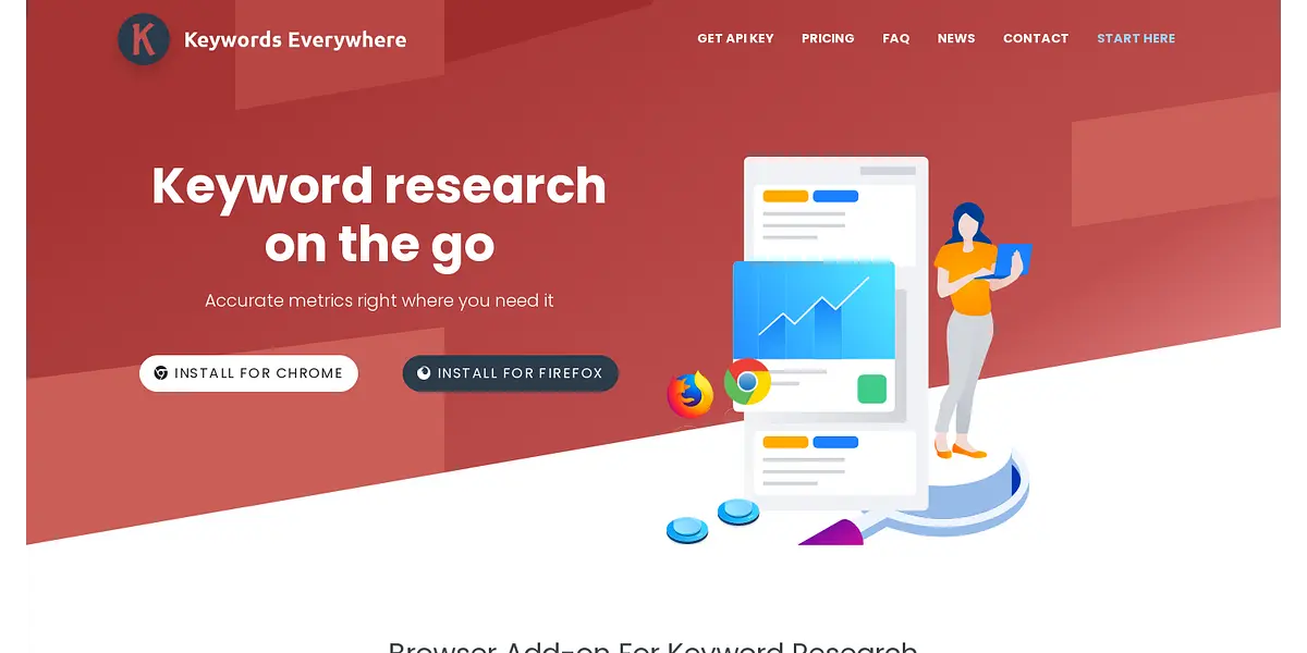 If you're looking for an easy and efficient way to perform keyword research, then you need Keywords Everywhere. This powerful browser add-on can be installed on either Chrome or Firefox and provides accurate keyword metrics in real time while you browse. Say goodbye to endless searching and copy-pasting between different platforms for your research!