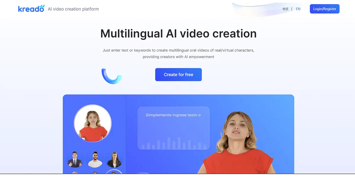 KreadoAI is an AI video creation platform that allows creators to generate captivating multilingual videos with real or virtual characters. Simply enter text or keywords and watch as the platform transforms them into oral videos. With KreadoAI, you can create for free using 140 multilingual real-life models and virtual characters, and AI-generated marketing copy.