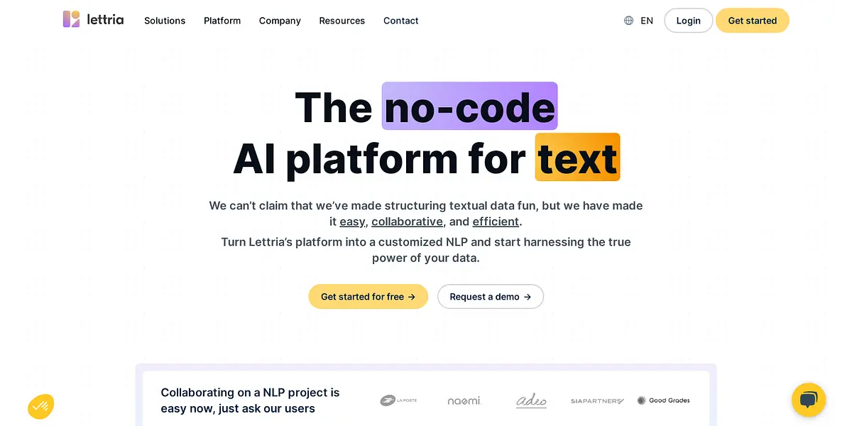 Lettria is revolutionizing the way businesses are analyzing and structuring their textual data with their no-code AI platform for text. With 85% of text processing projects destined to fail, Lettria set out to create a platform that makes NLP projects accessible, collaborative, and efficient for every member of the team. The platform's user-friendly data expert tools allow businesses to fine-tune project specs, label text, clean data, detect sensitive information, and classify documents faster and more accurately than ever before. Moreover, Lettria's NLP engine provides the best-in-class performance for all stages of the project. The platform is ideal for businesses who want to create their AI engine without coding, automate time-consuming and low value-added tasks, and organize unstructured data. Thanks to Lettria's intuitive design, anyone can work with text, regardless of the role, and start harnessing the true power of their data. Lettria's platform is divided into 3 main categories: Text Collection & Management, Text Labeling & Analysis, and Knowledge Management & Publishing. Each of these categories contains a set of tools that are fully customizable and can work together to create a seamless NLP pipeline. Lettria's platform also incorporates a range of pre-trained and customizable multilingual models, which allow businesses to handle complex data types and keep up with industry-specific terminologies. Additionally, Lettria's platform provides many use cases to help businesses understand how to integrate their platform into their workflows. Some examples include Voice2CRM, Search Engine Results Optimization, and Customer Feedback Analysis. Overall, Lettria's platform is perfect for businesses that want to get more out of their textual data without having to worry about coding, low accuracy rates, or time-consuming tasks. Get started with Lettria today and transform your textual data into valuable insights.