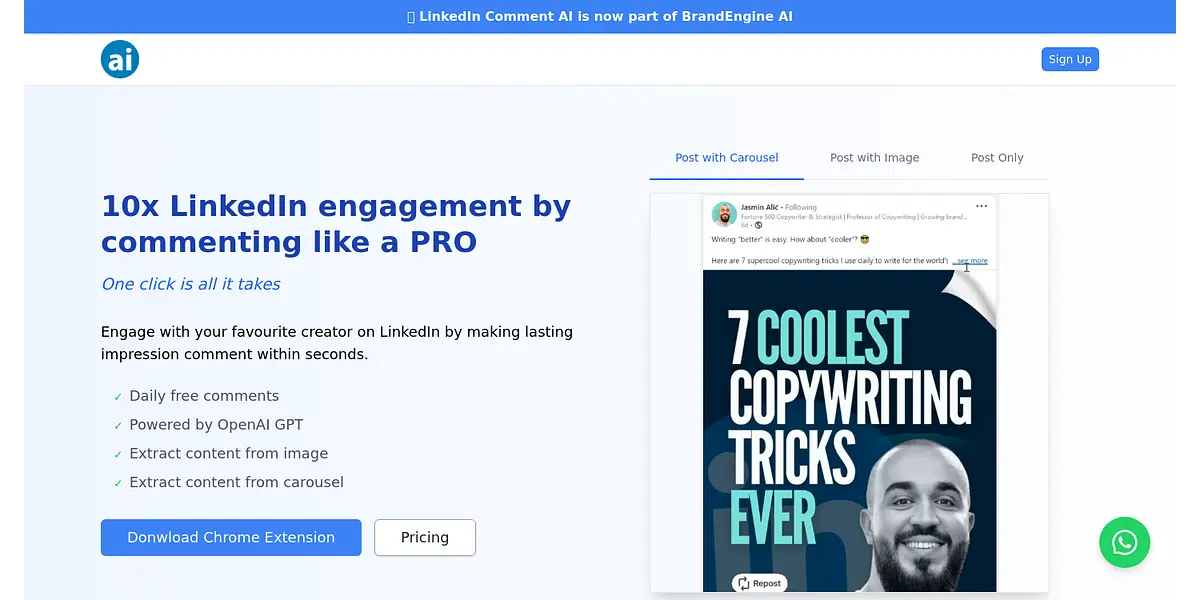 Sign up for BrandEngine AI's LinkedIn Comment AI and increase your LinkedIn engagement by 10x! Our AI-powered tool allows you to leave comments like a pro with just one click. Engage with your favorite creators by making a lasting impression through personalized comments created within seconds. Our tool is powered by OpenAI GPT and can even extract content from images and carousels.