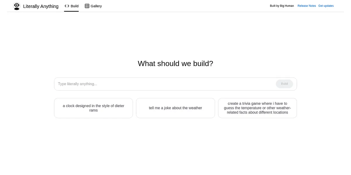 Big Human's Build Gallery enables users to generate new ideas and bring them to life through design. With options to build anything from a clock in the style of Dieter Rams to a trivia game, Build Gallery provides endless possibilities for creation.