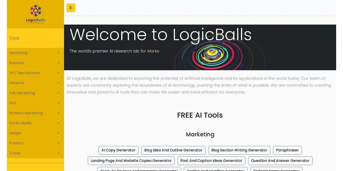 LogicBalls is the world's leading AI research lab offering FREE marketing and business tools. Create powerful content with AI copy, blog ideas, podcasts, webinars, and more. Unlock the true potential of artificial intelligence and make life easier and more efficient for everyone.