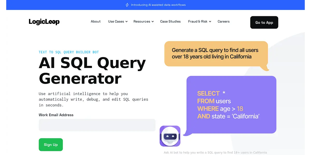 LogicLoop is an AI-assisted data workflow platform that focuses on helping businesses write, debug, and optimize their SQL queries in seconds. With LogicLoop, users can simply describe the data they want to query in plain English and let the AI helper generate the SQL code automatically.