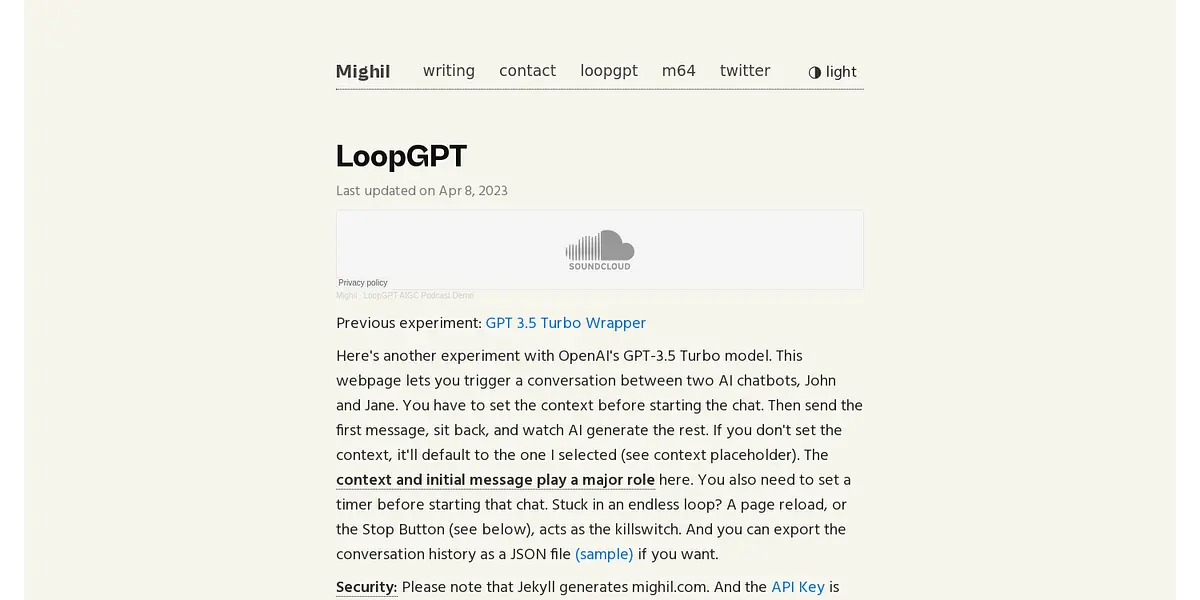 LoopGPT's experiment with OpenAI's GPT-3.5 Turbo model allows users to trigger AI conversations between two chatbots - John and Jane. Users must set the context and initial message before starting the chat and can export the conversation history as a JSON file. Additionally, a killswitch is available to stop the chat or reload the page. However, users should be aware of potential slow responses from the AI, as LoopGPT intentionally delays the POST requests to avoid throttling OpenAI's API rate limits. Furthermore, user security is assured, as Jekyll generates mighil.com and the API key is stored locally on the user's browser – it is never sent anywhere else. Though it may be a fun experiment, users must monitor OpenAI credits or risk them being consumed. LoopGPT's Turbo Model offers a unique and engaging experience to witness machine learning conversations.