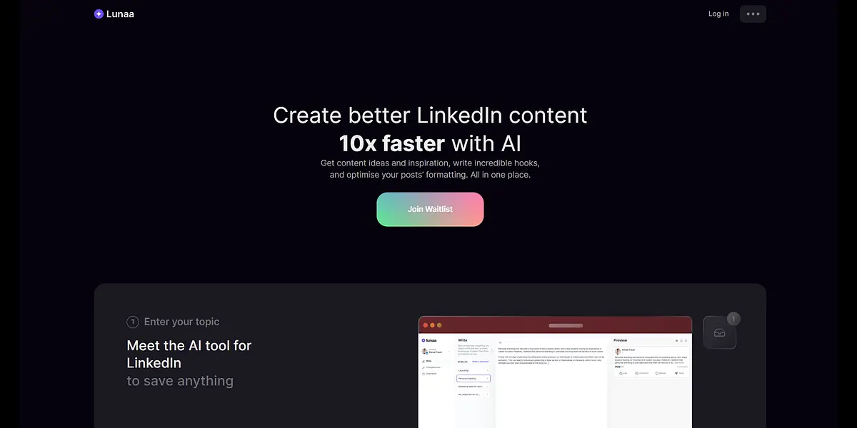 Join Lunaa's waitlist to stay up to date with the latest news and insights on AI-assisted content creation. Sign up early, and you'll be one of the first to access the innovative features that can elevate your LinkedIn profile to new heights.
