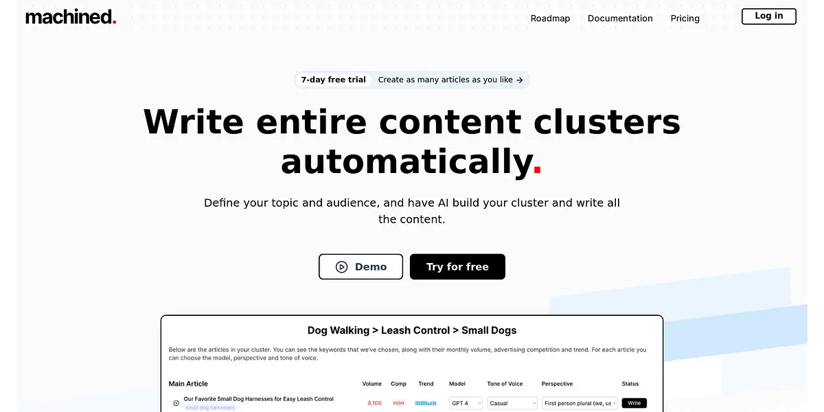 Machined is an end-to-end content generation machine that produces high-quality articles for any topic. With AI-powered keyword research, clustering, and interlinking, Machined offers a seamless solution for creating comprehensive content clusters. The platform supports over 100 languages, and offers scalable background processing, and unlimited bulk writing.