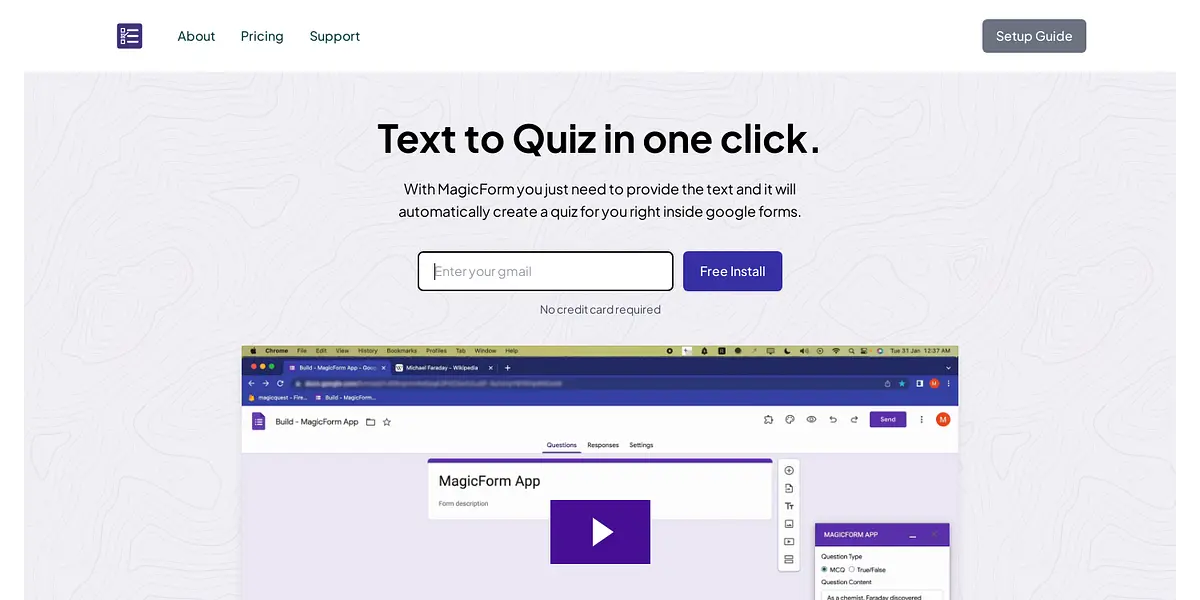 MagicForm is a Google Forms add-on that lets you create quizzes and tests in seconds without any technical knowledge. Simply paste the text and MagicForm will automatically generate quiz questions for you. It's perfect for teachers, students, HR teams, and publishers. Install MagicForm for free without any credit card requirement and streamline your assessment creation process today!