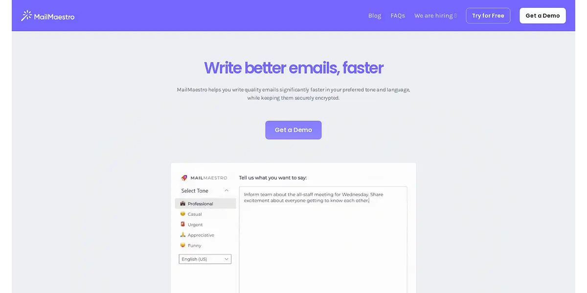 MailMaestro is an AI-powered email drafting tool that helps you write high-quality emails at lightning speeds. With an easy-to-use interface, choose your preferred tone and language, create bullet points or short phrases, and let MailMaestro craft the perfect email for you. Plus, your emails are always secure and encrypted. Try MailMaestro today and free up time for other important tasks.