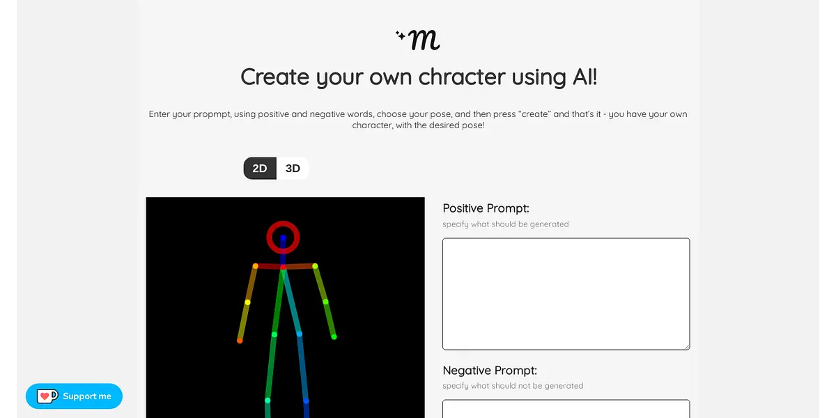 The process is simple - just enter your desired prompt and specify what you want and don't want to generate using positive and negative words. Choose your pose and press "create", and voila! You now have your very own character in either 2D or 3D with the perfect pose.