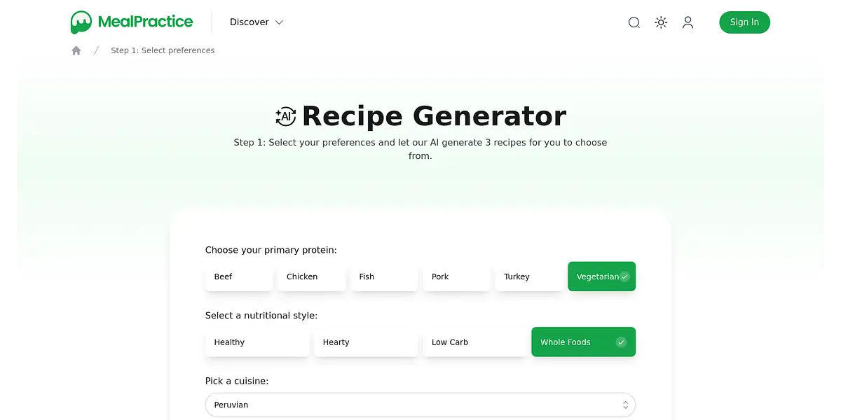 MealPractice is the ultimate recipe generator powered by AI. Select your ingredients and dietary preferences and let us suggest 3 mouth-watering recipes for you to choose from. From international dishes to hearty home-cooked meals, MealPractice has it all to satisfy your taste buds. Join our community and explore endless culinary possibilities today!