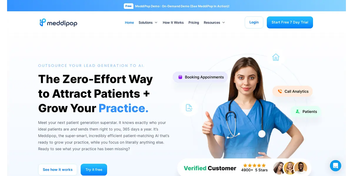Meddipop is an AI-powered patient-matching system that helps medical professionals attract and manage patients with zero effort. Their all-in-one dashboard allows organizations to easily organize leads, track data, manage billing, and more, while Meddipop matches you with ideal patients 365 days a year.
