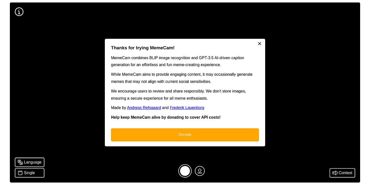 In conclusion, MemeCam is the ultimate tool for meme-creation, combining AI-powered image recognition and caption generation to deliver engaging content effortlessly. Donate to keep the website running, and enjoy the ultimate meme-creation experience today!