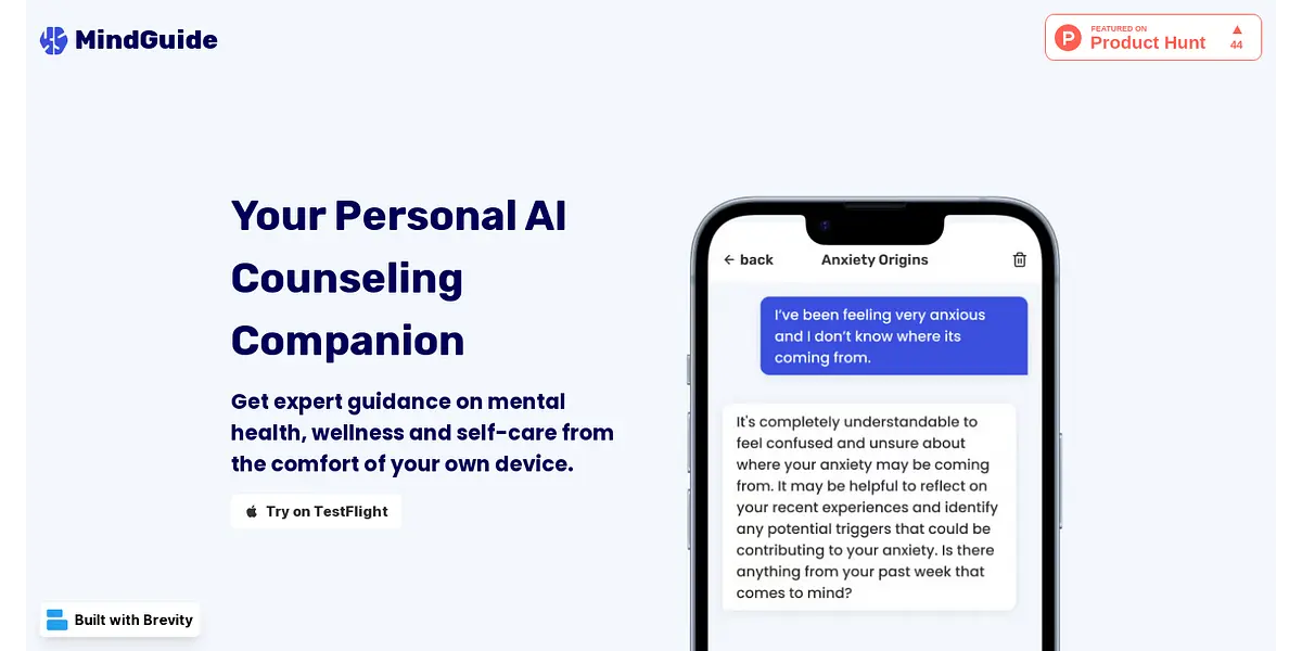 MindGuide is an AI-powered counseling companion that offers expert guidance on mental health, wellness, and self-care. With MindGuide, you can elevate your mental health from the comfort of your own device. Try it today on TestFlight.