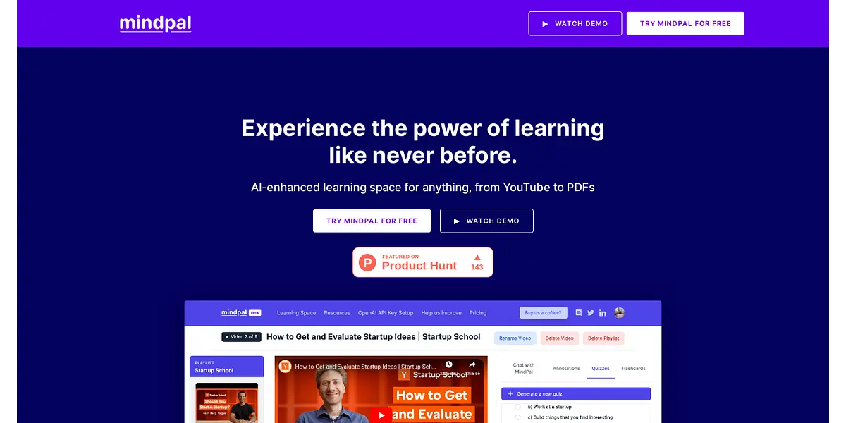 "Experience effortless and engaging learning with MindPal - the AI-enhanced learning space for anything, from YouTube to PDFs. With auto-generated quizzes, built-in support features, and an AI tutor, MindPal makes learning a breeze. Join our exclusive Discord community for special offers and try MindPal for free today!"