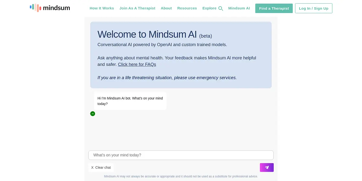 Mindsum AI is still in beta, and your feedback helps us make our technology more helpful and safer for everyone. We acknowledge that our platform may not always be perfect and should not be used as a substitute for professional advice. If you are in a life-threatening situation, we urge you to use emergency services.