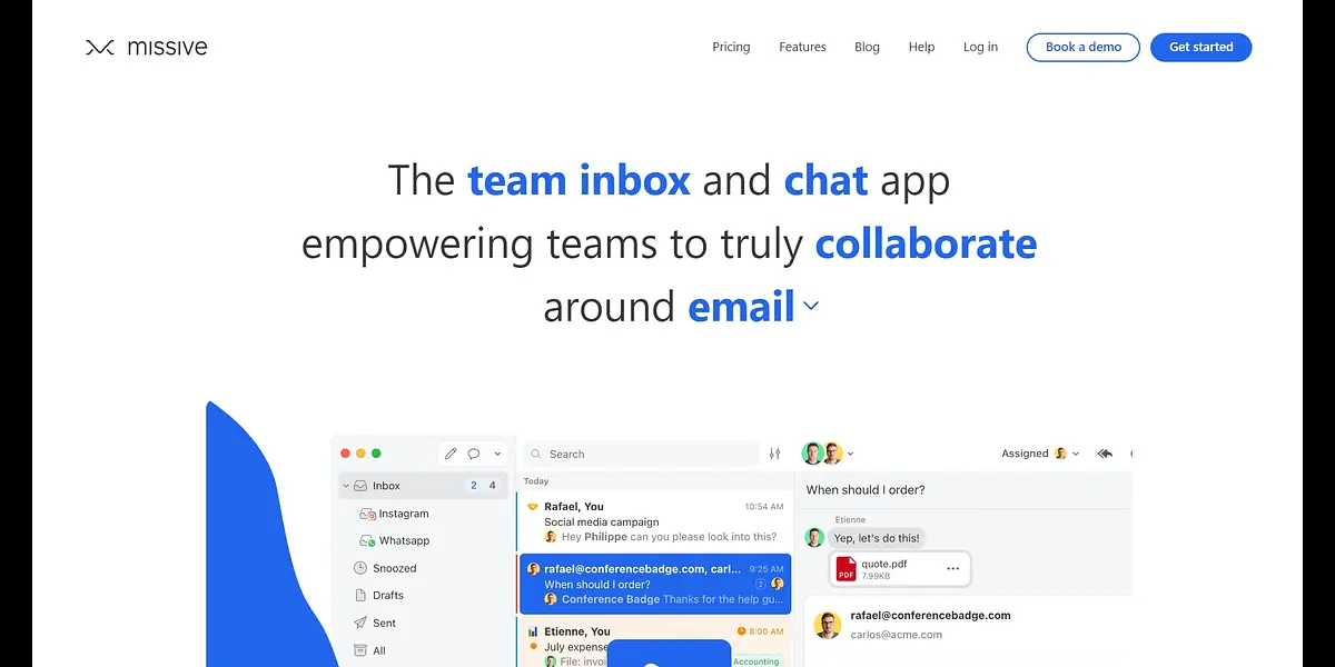 Missive is an inbox and chat app that empowers teams to collaborate around email, SMS, WhatsApp, Twitter, Messenger, live chat, custom Instagram, and more. With Missive, teams can stay accountable, efficient, and focused, with shared or private communication channels streamlined in a single app. Discover a new level of clarity, teamwork, and productivity.