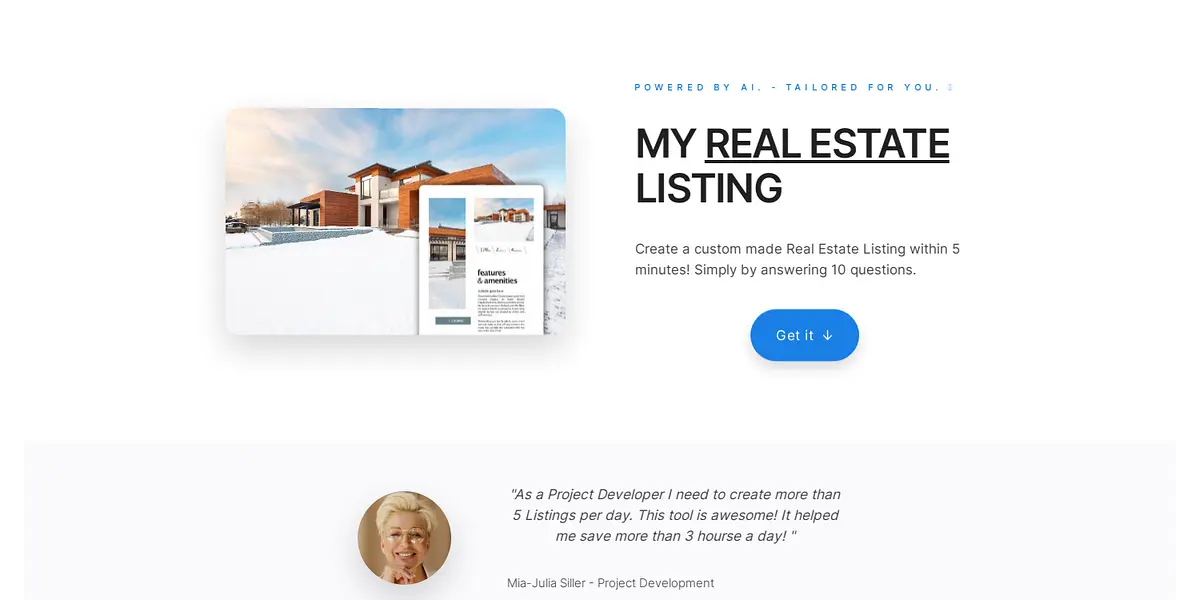 My Real Estate Listing offers an innovative AI-powered tool that helps create custom real estate listings in just a few minutes. By answering just 10 questions, users can create a sales brochure that is tailored to their specific property. The tool saves users time and allows them to create professional-looking listings without the need for special skills or knowledge.